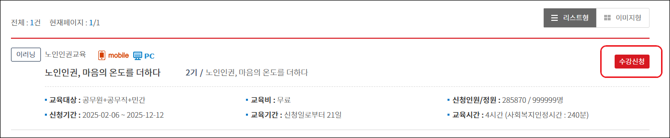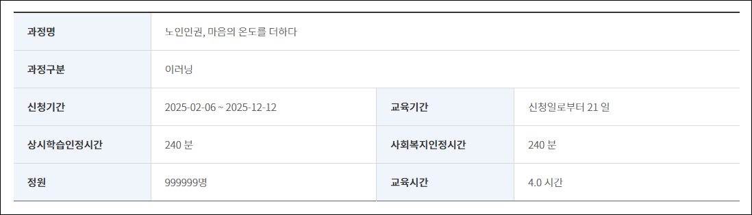 본 항목에서는 노인인권 의무교육을 예시로 들어, 의무교육의 수강신청 방법을 단계별로 안내드립니다. 타 과정 또한 동일하게 수강신청이 이뤄지니 참고하시기 바랍니다. 또한 각 과정별 수강기간은 상이할 수 있으니 반드시 본인의 필요과정에 대한 정보들을 정확히 확인 하셔야됨을 전달드립니다.