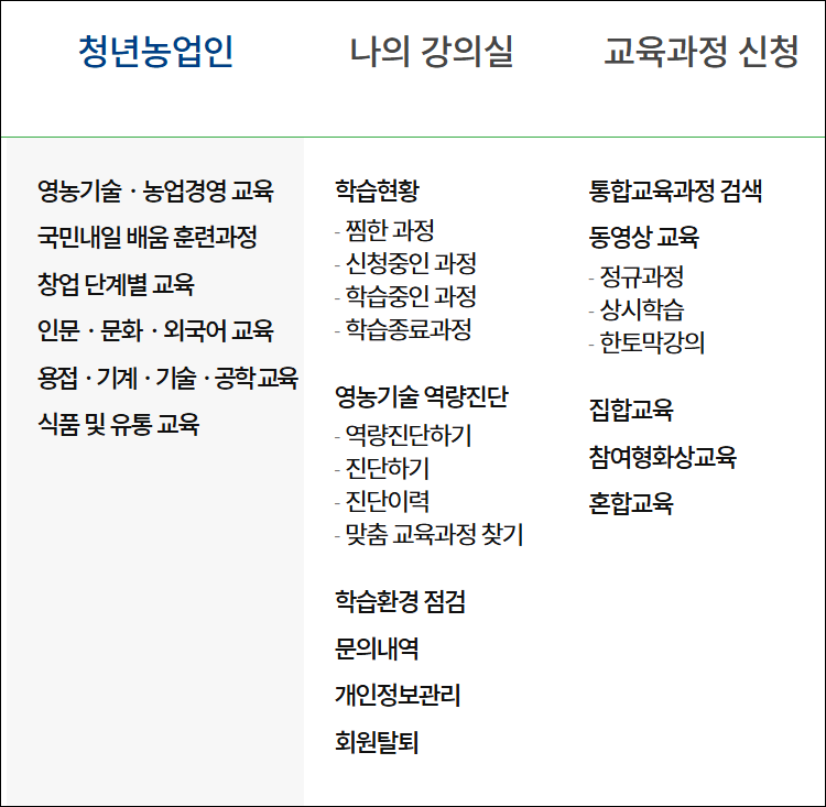 | 회원가입 필수 | 수강신청 전에 반드시 농업교육포털에 회원가입을 해야 합니다. 로그인 후 수강 신청 가능합니다. |
