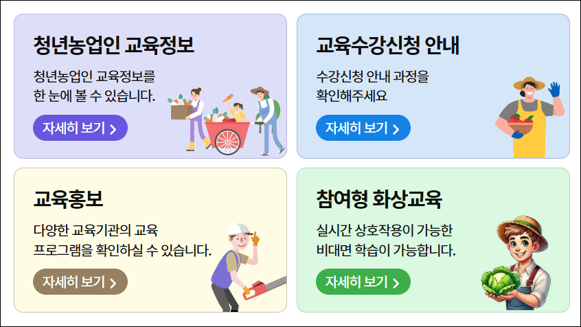 | 정확한 정보 입력 | 신청 시 본인 정보 및 농업경영체 등록 정보를 정확히 입력해야 합니다. 잘못된 정보 입력 시 이수 인정이 안 될 수 있습니다. |