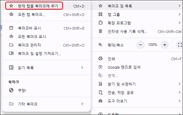 - 크롬: 주소창 오른쪽 ★ 아이콘 클릭 → ‘북마크 추가’ 선택