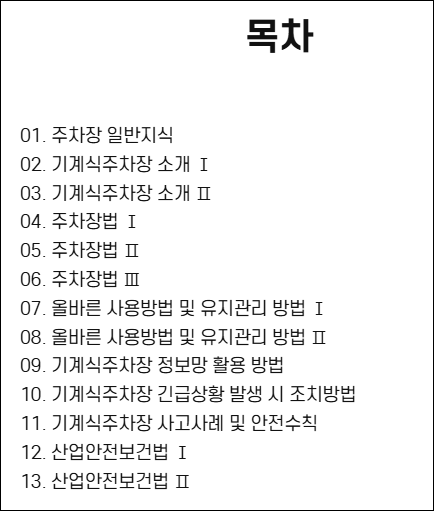 기계식 주차장 관리인 교육은 단순한 이론 수업이 아닌, 현장에서 바로 적용 가능한 실무 중심의 교육입니다. 한국교통안전공단에서 제공하는 교육은 아래와 같은 항목들로 구성되어 있으며, 각 항목은 이론과 사례 중심으로 진행됩니다.