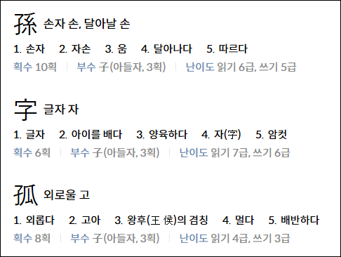 아래 절차를 통해 한자를 다 쓰고 나면 실시간으로 오른쪽에 유사한 글자들이 리스트업 되며, 이를 클릭하면 해당 한자의 뜻, 음, 예문 등을 바로 확인할 수 있습니다.