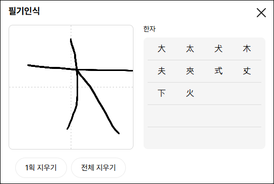 필기인식 영역에 한자를 너무 작게 쓰면 인식률이 떨어질 수 있습니다. 입력창을 적당히 꽉 채우는 크기로 그리면 더 정확하게 인식됩니다.