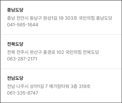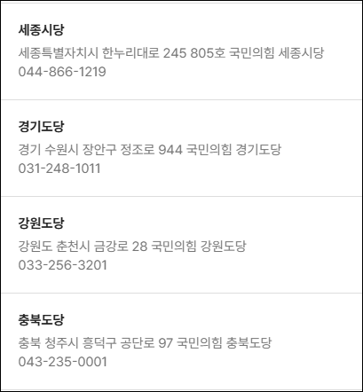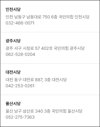 아래의 이미지들을 참고하시면, 시·도당 연락처 및 주소를 확인할 수 있습니다. 각 시·도당은 팩스번호, 이메일 주소도 함께 운영 중입니다. 제출 전 반드시 전화로 접수 가능 여부 확인을 권장합니다.