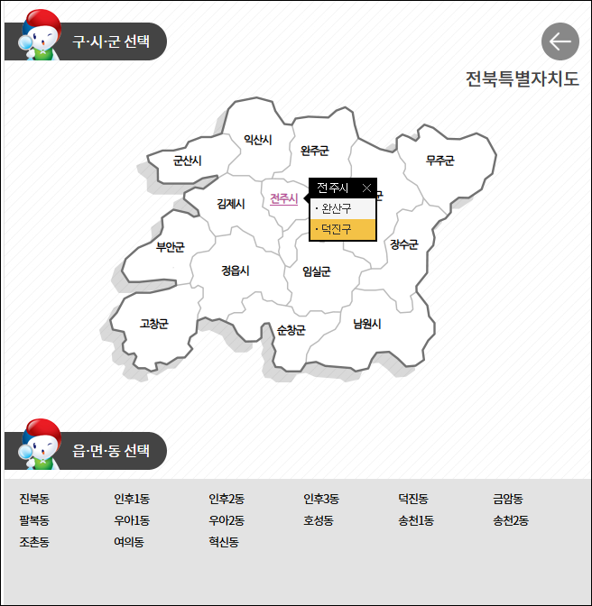 시·군·구, 읍·면·동 등 거주지 또는 원하는 지역의 정보를 입력해 검색합니다. - 검색 결과 확인