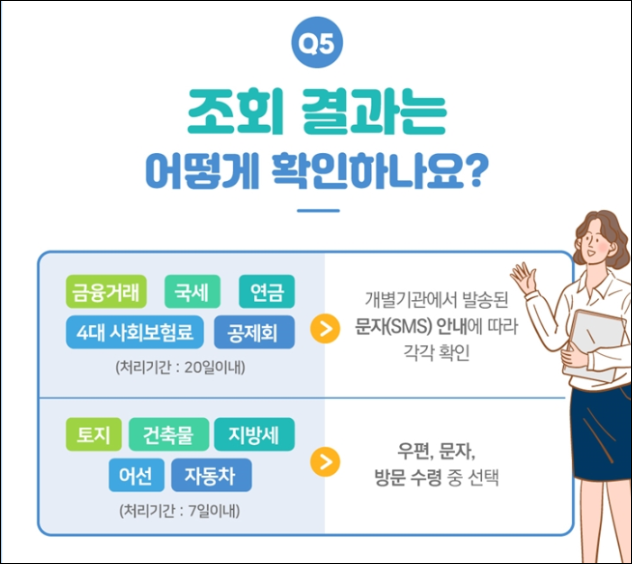 | 금융, 국세, 연금 | 최대 20일 이내 | 문자 수신 후 각 기관 홈페이지에서 개별 확인 |