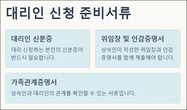 위임장, 상속인의 본인서명사실확인서 또는 인감증명서 등 추가서류 필요 |