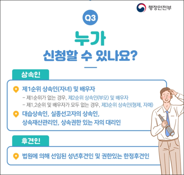 1순위 상속인인 자녀나 배우자가 신청하는 것이 원칙이며, 온라인 신청도 이들에게만 가능합니다.