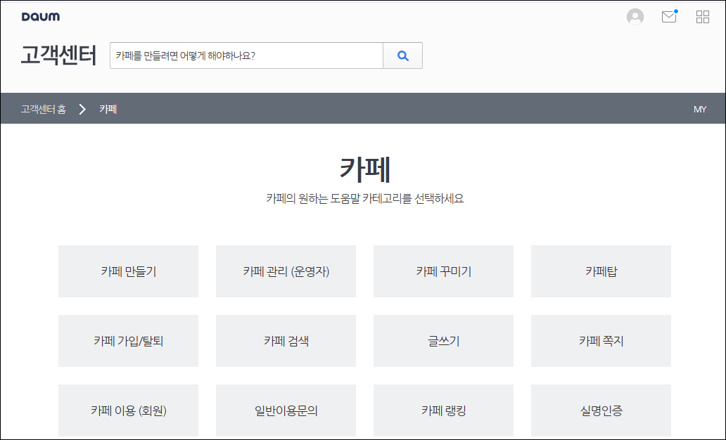 다음 포털 로그인 후 다음 메인 페이지 로그인 후 상단 메뉴에서 ‘카페’ 클릭 후 ‘내카페’ 바로가기 선택