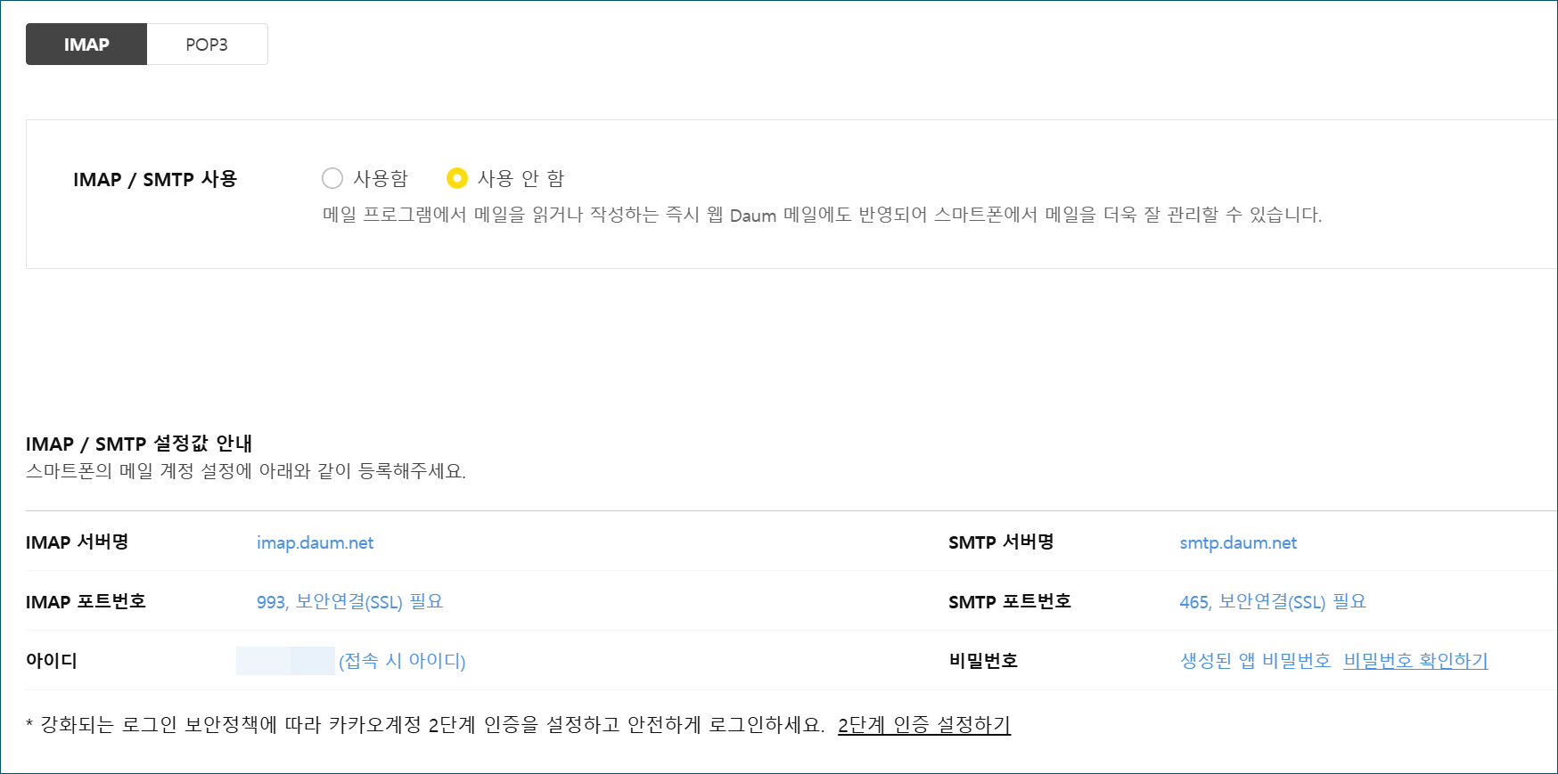 - 수신서버(IMAP): imap.daum.net, 포트: 993, SSL 사용