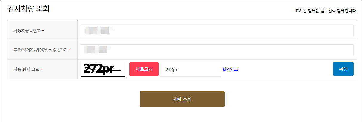 - 차량번호와 주민등록번호 앞 6자리를 입력 후 조회
