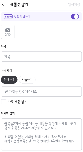• 판매할 물건의 사진, 제목, 카테고리, 가격, 그리고 상세 설명을 꼼꼼히 입력한 후 등록합니다.