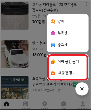• 하단의 ‘+’ 버튼을 눌러 ‘내 물건 팔기’를 선택합니다.