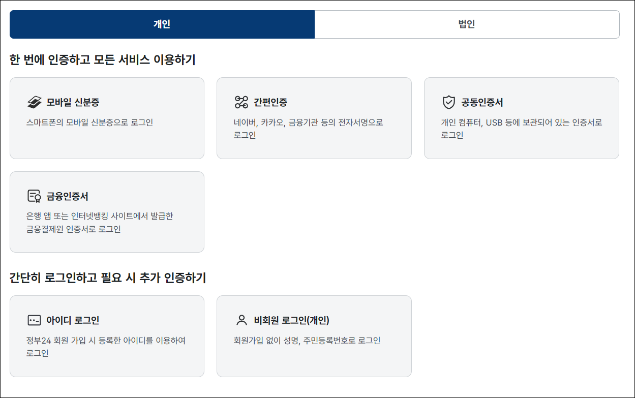 - 아이디와 비밀번호를 입력하거나, 인증서를 통해 로그인할 수 있습니다.