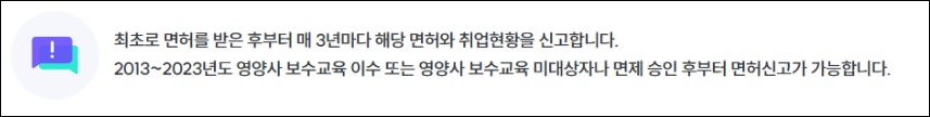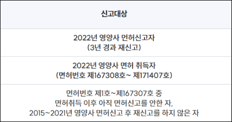 | 면제 대상자 | 해당 연도 말(12.31)까지 영양사 업무를 일시적으로 중단한 경우 | 출산, 육아휴직, 질병 휴직, 해외 체류, 군복무 등 |